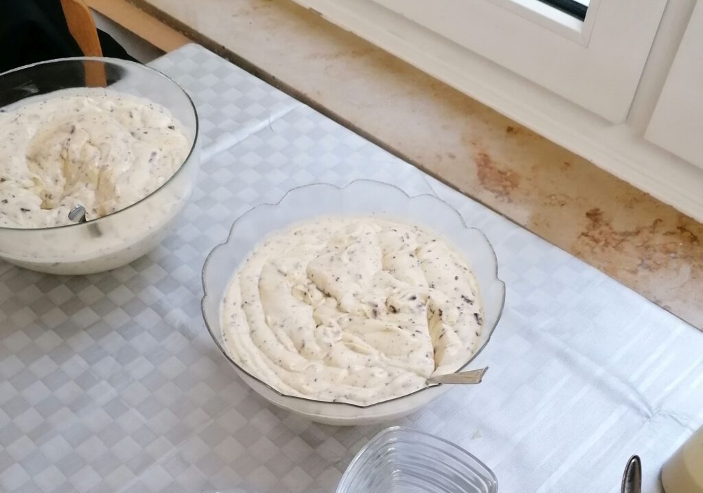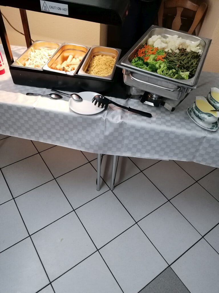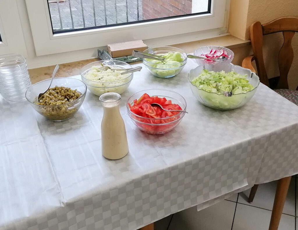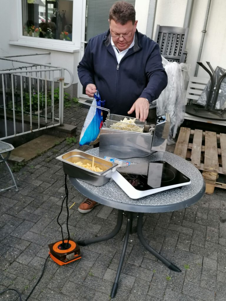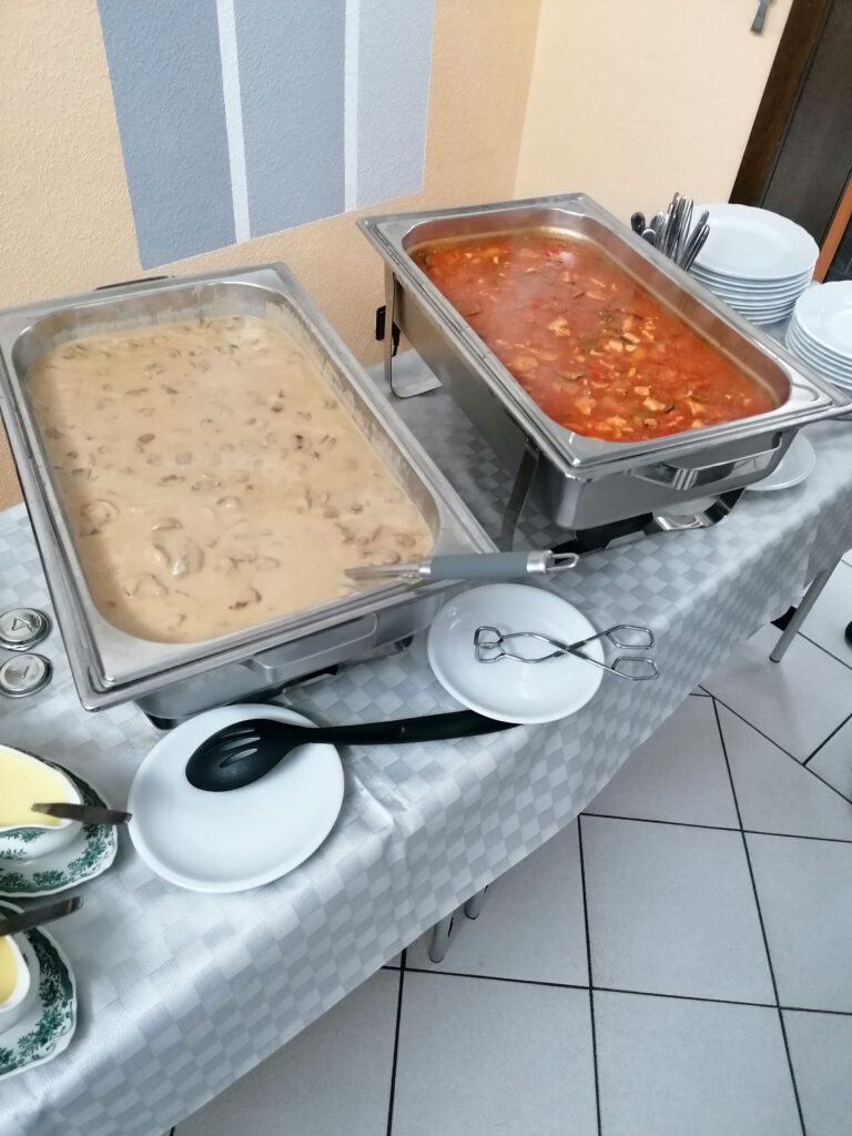Thomas Wehner hatte mit seiner Familie ein tolles Menü vorbereitet. Es gab Schweinefilet in Champignonsoße, eine Hähnchenfitnesspfanne mit Paprika, Zwiebeln und Zucchini in Tomatensoße. Dazu eine bunte Gemüseplatte mit Sauce Hollandaise sowie frischen gemischten Salat mit Coktaildressing. Als Beilagen Pommes frites, Kroketten und Spätzle. Zum Dessrt die wunderbare Herrencreme von Mechtild Weidemann.
